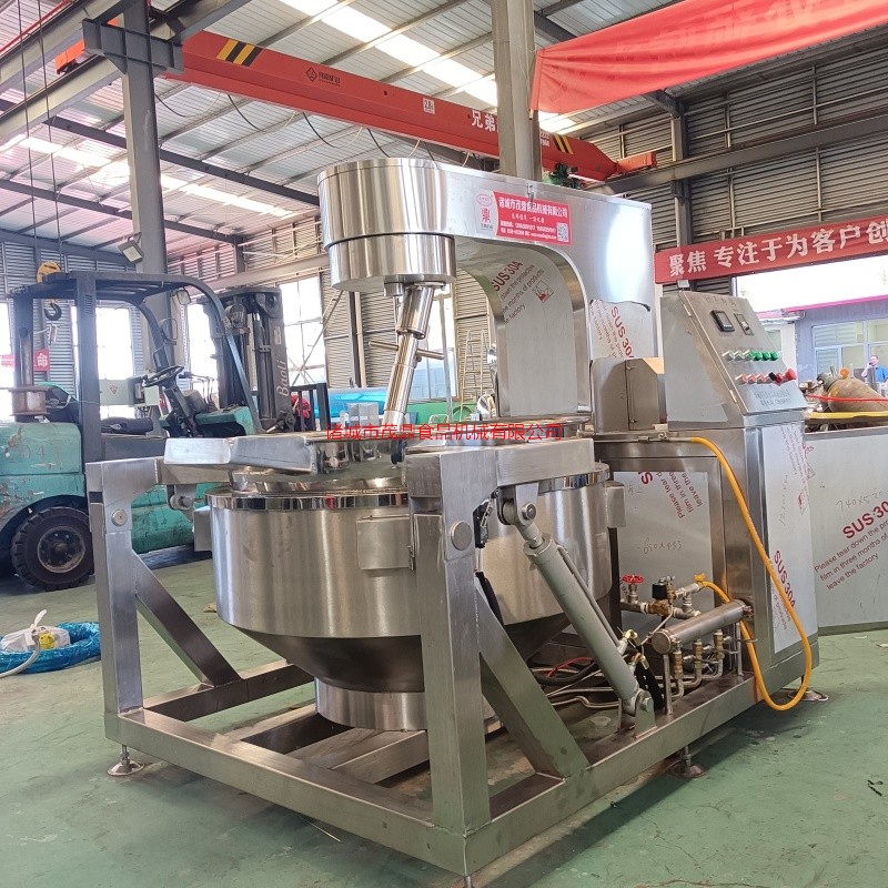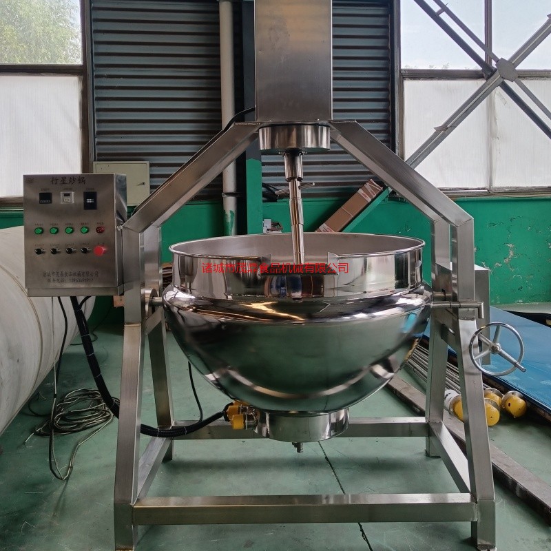 行星攪拌炒鍋主要由鍋體、架體、攪拌系統、加熱系統、調速傳動裝置、攪拌軸、鍋體翻轉系統等組成。行星炒鍋加熱方式可分為電加熱、燃氣加熱、蒸汽加熱、電磁加熱等方式。行星炒鍋適用于:火鍋底料、月餅餡料、高粘度物料、果醬、年糕、辣椒醬、食堂、阿膠、熬湯、豆蓉、豆沙、芝麻醬、五谷豆漿、方便面醬料、香菇醬等食品加工攪拌炒制。行星炒鍋采用不銹鋼制作,攪拌徹底、無死角、攪拌均均、不易糊鍋。攪拌器和刮板結構設計獨特,物料攪拌混合更均勻,刮底更徹底,不容易產生糊鍋現象。